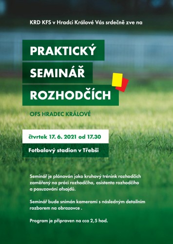 Krajský fotbalový svaz Královéhradeckého kraje a její KRD organizuje praktický seminář pro začínající rozhodčí zaměřený na práci rozhodčího, asistenta rozhodčího a posuzování ofsajdů. První z těchto praktických seminářů se uskuteční ve čtvrtek 17.6.2021 v Hradci Králové v Třebši.