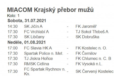 "MIACOM Krajský přebor mužů". Hned několik týmů v této soutěži si netají ambicemi na postup do vyšší soutěže, a tak bude zajímavé sledovat, jak své plány a prohlášení naplní v realitu. V úvodním kole není na pořadu žádné derby utkání, a tak bude zajímavé sledovat, jak týmy odstartují své úvodní zápasy nové sezóny.