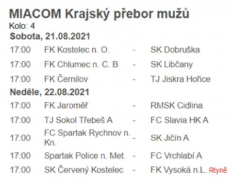 Čtvrté kolo nejvyšší krajské soutěže "MIACOM Krajský přebor mužů" slibuje o tomto víkendu jedno veliké hradecké derby a jasný šlágr kola v podání utkání prvního týmu s druhým.
